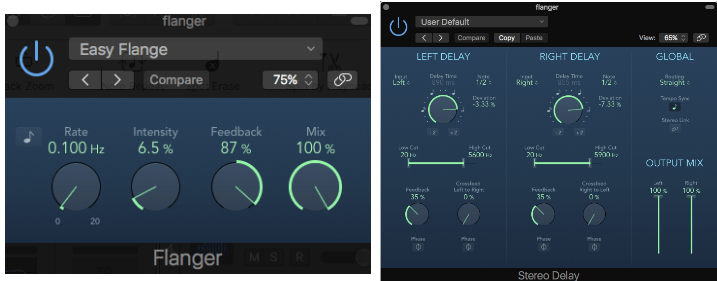 After recording a strumming part panned left, I decided to record a picking guitar part to pan right, and to give this more tonality and character, I used the effect of a Flanger combined with a stereo delay and echo.